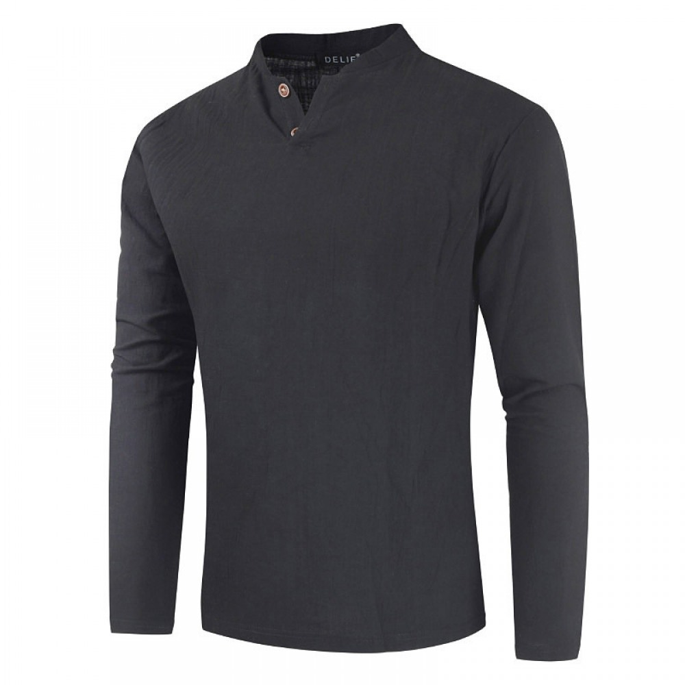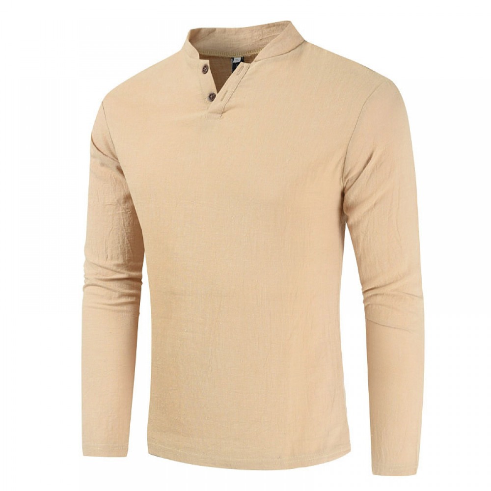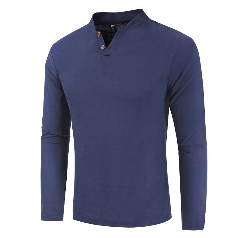 Men's Cotton and Linen Long-Sleeved Pullover Fashion Urban Unhooded Stand-Up Collar Men's T-Shirt